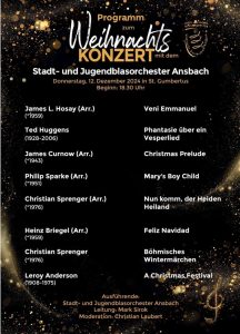 Ansbach, 4. Dezember 2024 – Das Stadt- und Jugendblasorchester bringt wieder ein weihnachtliches Programm auf die Bühne, genauer gesagt in die Gumbertuskirche. Das Weihnachtskonzert findet erstmals unter der Leitung von Mark Sirok am Donnerstag, den 12. Dezember 2024 um 18.30 Uhr statt.