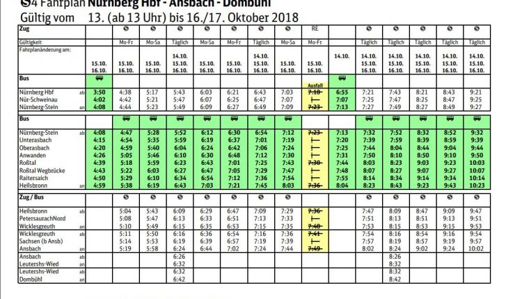 Im oben genannten Zeitraum müssen alle S-Bahnen zwischen Nürnberg Stein und Heilsbronn entfallen. Ein Schienenersatzverkehr ist eingerichtet. Die RE Züge entfallen auf dem Streckenabschnitt Nürnberg – Ansbach