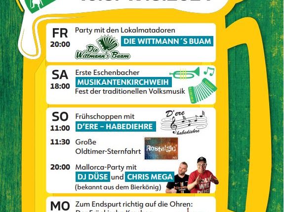 Höhepunkte werden dabei sicher wieder das große Baum-Aufstellen mit den Kerwabuam und Kerwamadli am Samstagnachmittag sowie eine Neuerung am Samstag Abend die 1. Eschenbacher Musikaten Kerwa. Ab 18 Uhr erwartet Sie echte Blasmusik im Bierzel am Festplatz. Für Stimmung werden der Musikverein Wolframs-Eschenbach und Ornbau, die Kammersteiner Blasmusik, Musikfreinde Unternbibert e. V. sowie die Hofer Böhmische sorgen.