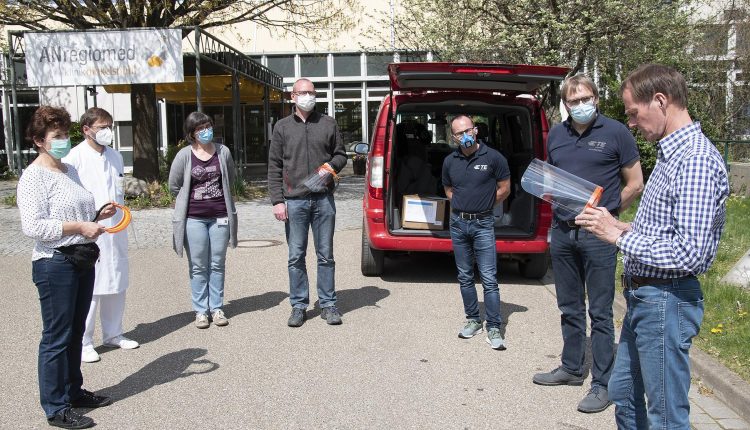 150 solche Gesichts-Schilde haben diese Woche Jürgen Ohr und Martin Huber von der TEConnectivity Germany GmbH mit Sitz in Dinkelsbühl und Wört als Spende in die Klinik Dinkelsbühl gebracht. Sie kommen in den Isolierbereichen der Kliniken Dinkelsbühl und Ansbach zum Einsatz. TE Connectivity steht weltweit für die Produktion von Schaltern, Steckverbindungen und Sensoren, unter anderem für die Automobilbranche. Von den Schutzvisieren aus Kunststoff sind die ersten Exemplare auf dem 3D-Drucker entstanden: Sie waren zunächst nur für die eigenen Mitarbeiter bestimmt.