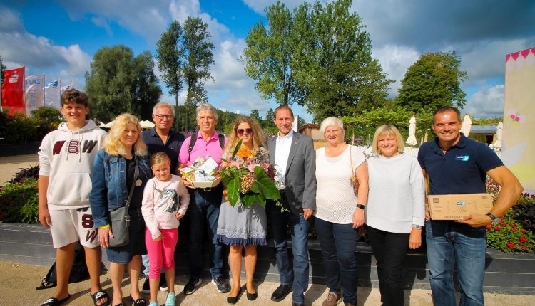 Raphaela Hoppe aus Mering bei Augsburg besuchte am Freitag mit ihren Eltern und ihren Kindern die Gartenschau der Heimatschätze und wurde bereits am Eingang mit Blumenstrauß, Geschenkkorb und einem Auflauf aus Pressevertretern begrüßt. „Ich habe ein Plakat von der Gartenschau im Botanischen Garten in Augsburg gesehen.“, erzählt die 43-jährige, glückliche Gewinnerin. Schnell wurde der Entschluss gefasst Wassertrüdingen einen Besuch abzustatten. „Eigentlich wollten wir bereits am Mittwoch kommen.“ Ein glücklicher Zufall, dass die Familie doch am Freitag zur richtigen Zeit am richtigen Ort war. „Ein schöner Tag auf der Gartenschau ist so gleich noch schöner geworden.“, erklärt Raphaela Hoppe lachend.