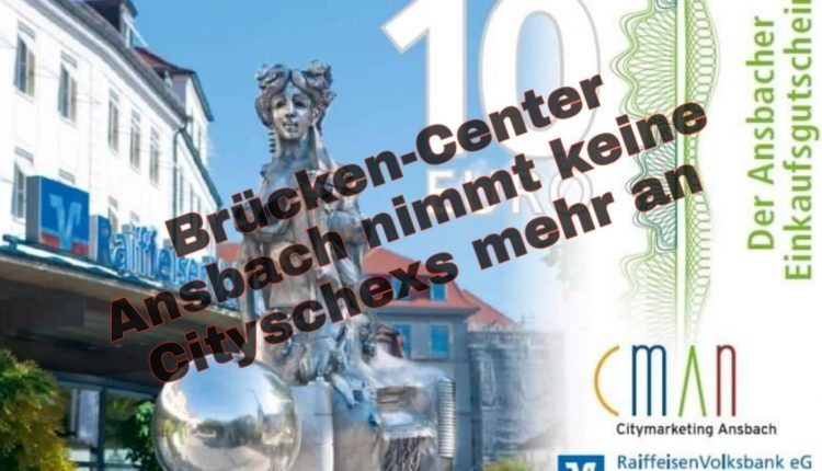 Trotz mehrerer Gespräche zwischen CMAN und der Geschäftsführung des Brücken-Centers konnte leider keine gemeinsame Lösung gefunden werden, so dass die Geschäfte des Brücken-Centers ab dem 1. Juli 2019 keine CitySchexs mehr annehmen werden. Aktuell führt CMAN Gespräche mit Händlern im Brücken-Center, um so zu erreichen, dass diese weiterhin – auch unter den für sie neuen Konditionen – Akzeptanzstelle bleiben. Für Rückfragen steht Ihnen Lukas Kratzer (per Tel. 0981/3577085, per E-Mail kratzer@citymarketing-ansbach.de) gerne zur Verfügung.