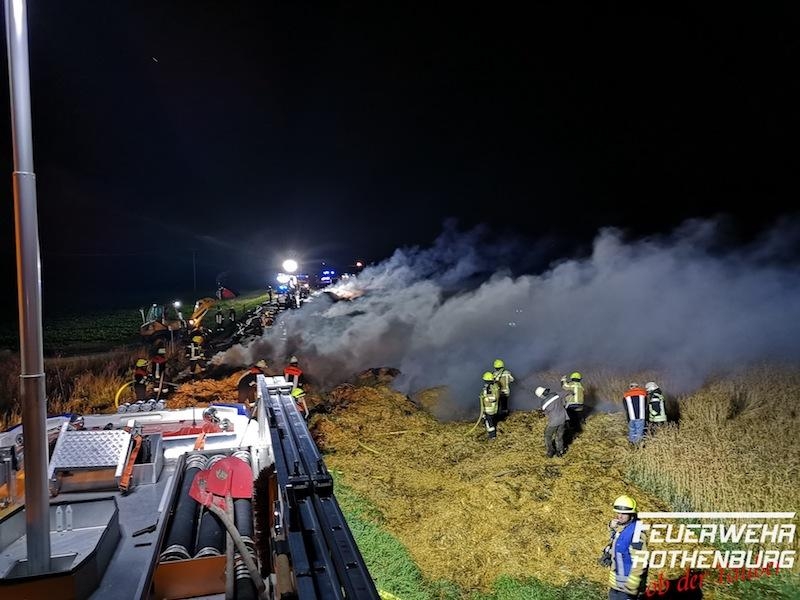 Am 07.07.18 transportierte kurz vor Mitternacht ein Traktorfahrer mit seinem Anhänger in Neustett eine Ladung mit 26 gepressten Strohballen. Auf der Fahrt nach Gickelhausen bemerkte er plötzlich Rauch aus den geladenen und festgezurrten Strohballen. Da ein eigenhändiger Löschversuch scheiterte, kuppelte der 58-jährige Fahrer den Hänger vom Traktor ab, löste die Spanngurte, so dass die teils brennenden Strohballen abgeladen werden konnten. Der Anhänger geriet jedoch in Vollbrand, in dessen Folge sich die arretierten Brem-sen lösten und der brennende Anhänger unkontrolliert ca. 150 m in Richtung Gickelhausen rollte. Während dieser Irrfahrt lösten sich brennende Strohballen vom Anhänger, fielen auf den ausgetrockneten Boden und lösten dort verschiedene kleine Brände an den angrenzenden Feldern aus. Den eingesetzten Freiwilligen Feuerwehren aus Gickelhausen, Neustett, Adelshofen und Rothenburg ob der Tauber mit ca. 75 Einsatzkräften gelang es schließlich gegen 04.20 Uhr sämtliche entstandenen Brände zu löschen. Der entstandene Schaden wird nach ersten Schätzungen auf ca. 20.000 Euro beziffert.