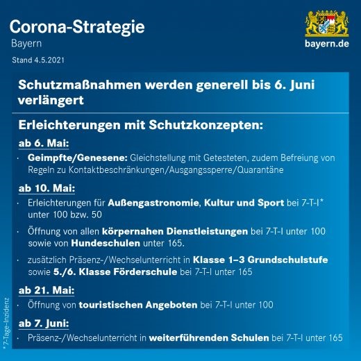 - ab 10. Mai werden Hundeschulen bei einer stabilen Inzidenz unter 165 zugelassen.