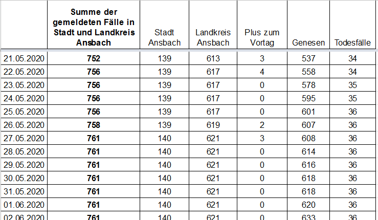 Aktuelle Zahlen zu Covid-19 in Stadt und Landkreis Ansbach – 08.06.2020
