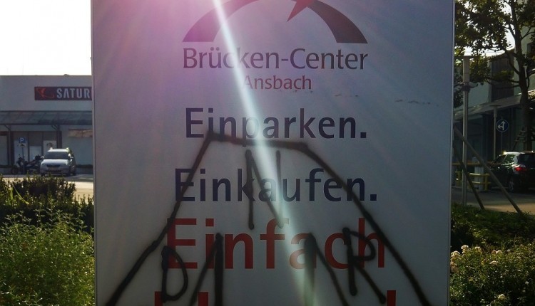 Ein Unbekannter hinterließ auf einer Werbetafel des Brücken-Centers Ansbach ein Graffiti mit den Buchstaben „D N R“ in schwarzer Farbe. Die Schmiererei dürfte in der Zeit von Di., 20.00 Uhr bis Mi., 07.30 Uhr angebracht worden sein, der Schaden beläuft sich auf 250 Euro. Hinweise werden erbeten an die Polizeiinspektion Ansbach unter der Tel.Nr. 0981/9094-121.