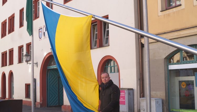 Thomas Deffner die ukrainische Flagge vor dem Ansbacher Rathaus hissen.