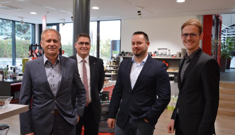Wolfgang Langer, stv. Geschäftsführer der Agentur für Arbeit Ansbach-Weißenburg (2.v.l.) informierte sich im Rahmen der Jahrespressekonferenz zum Ausbildungsmarkt bei der Firma Rommelsbacher über deren Sortiment und die dort angebotenen Ausbildungsberufe. Mit abgebildet sind (von links) der Geschäftsführer der Firma Rommelsbacher, Herr Willi Klenk, der Technische Leiter Benjamin Blumenstock und der Assistent der Geschäftsleitung Christian Bär. Auf Bild Nummer 2 zusätzlich abgebildet drei Auszubildende der Firma Rommelsbacher.