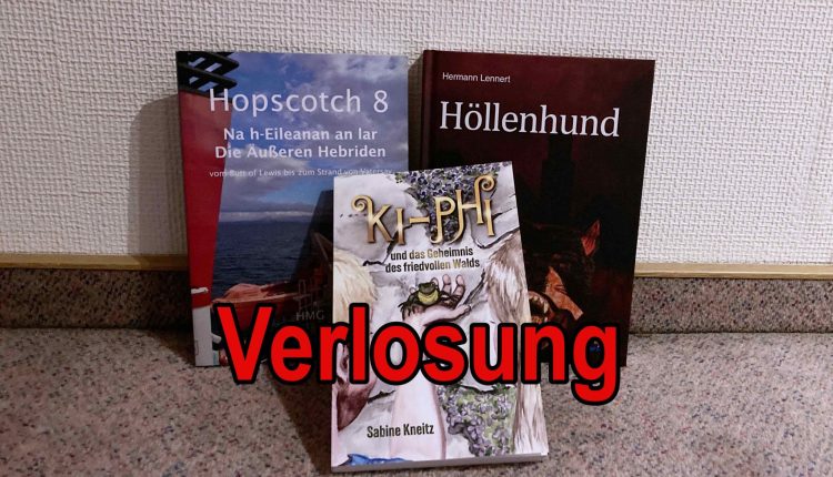 Zu gewinnen gibt es jeweils ein Exemplar des Buches „Ki-Phi und das Geheimnis des friedvollen Walds“ von Sabine Kneitz, „Höllenhund“ von Hermann Lennert und „Hopscotch 8 – Na h-Eileanan an lar – Die Äußeren Hebriden“ von Hans-Martin Goede.