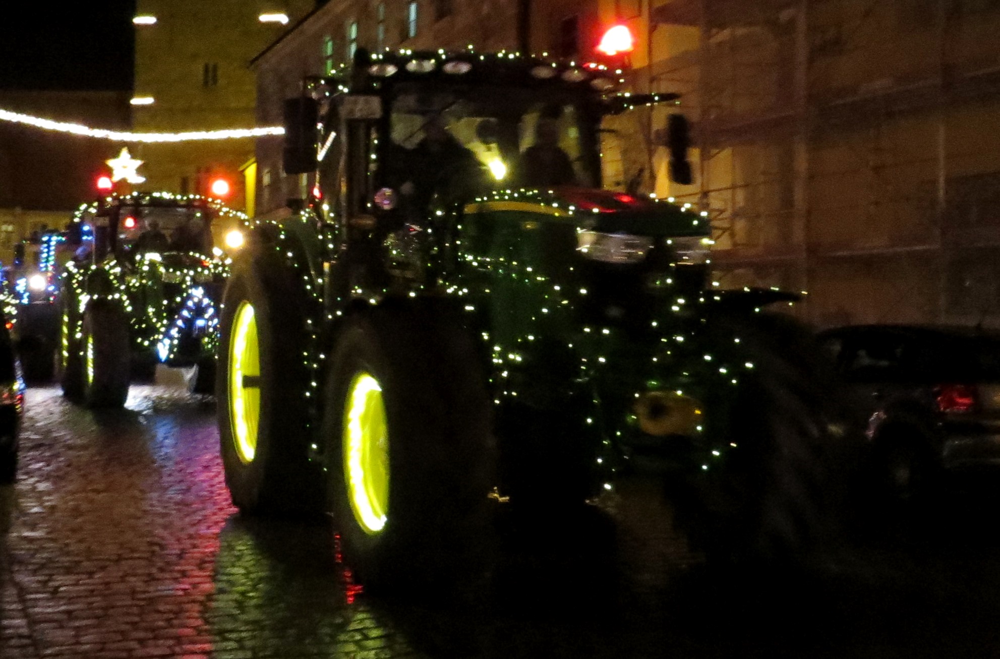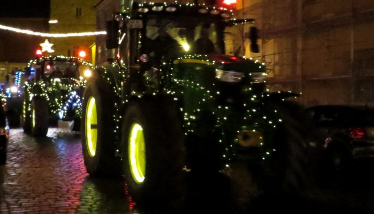 Hierzu fanden sich auf dem Parkplatz Schießwasen ca. 30, mit bunten Lichterketten geschmückte, Traktoren ein. Diese fuhren in der Folge auf zwei unterschiedlichen Routen durch das Stadtgebiet, insbesondere an den örtlichen, Alten- und Pflegeheimen vorbei und vereinten sich schließlich in der Erkenbrechtallee zu einem Gesamtzug. Dieser fuhr im weiteren Verlauf über die Oberntiefer Straße und Westring zum Endpunkt am Parkplatz des Freilandmuseums.