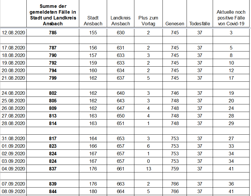 Noch aktuell positive Fälle in Stadt und Landkreis Ansbach August und September 2020 | Stand 08.09.2020 | Fränkischer.de