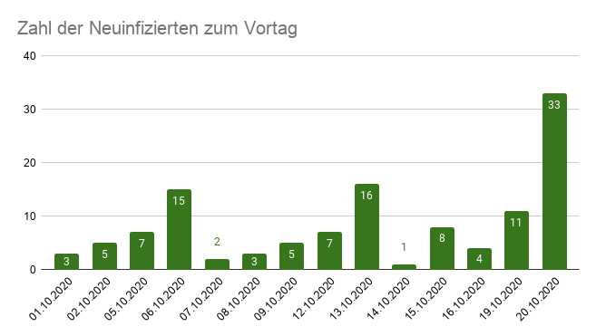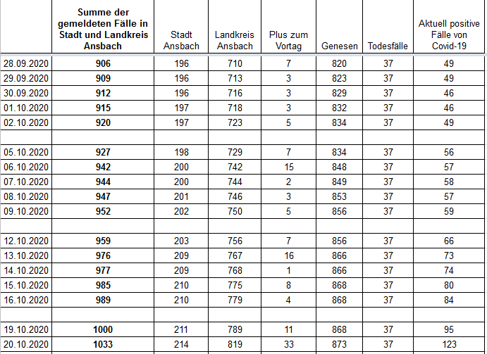Kreis Ansbach, 20.10.2020 – Es gibt insgesamt 1.033 bestätigte Corona-Fälle in Landkreis Ansbach und Stadt Ansbach, ein Plus von 33 Infizierten zum Vortag.