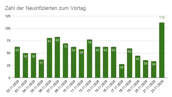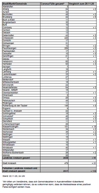 Die 7-Tage-Inzidenz pro 100.000 Einwohner im Ansbacher Landkreis liegt bei 139,23 (Vortag 113,77), bei der Stadt Ansbach bei 129,19 (Vortag 81,34). (Stand: 22.11.2020, 08:00 Uhr)