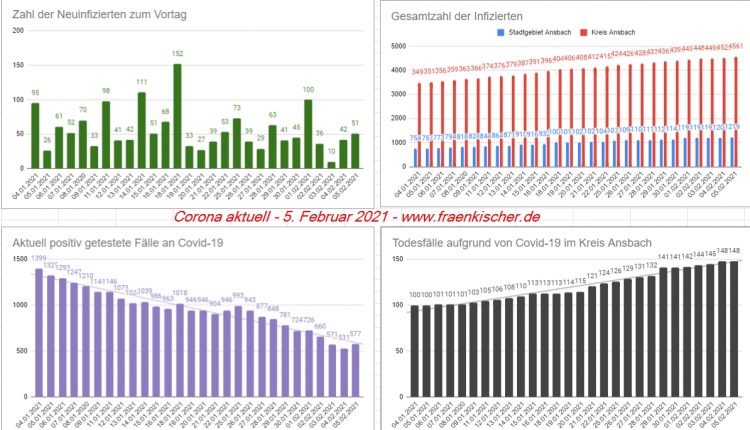 Kreis Ansbach, 05.02.2021 – Im Vergleich zur letzten Meldung gibt es 51 weitere Infektionsfälle und damit seit Beginn der weltweiten Corona-Pandemie insgesamt 5780 bestätigte Corona-Fälle in Landkreis Ansbach und Stadt Ansbach.