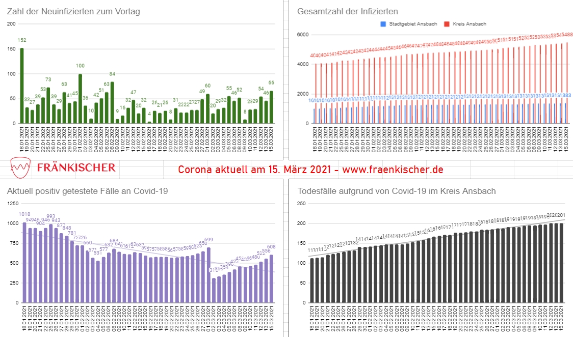 Stadt und Landkreis Ansbach, 15. März 2021 – Im Vergleich zur letzten Meldung gibt es 66 weitere Infektionsfälle und damit seit Beginn der weltweiten Corona-Pandemie insgesamt 6.871 bestätigte Corona-Fälle in Landkreis Ansbach und Stadt Ansbach.