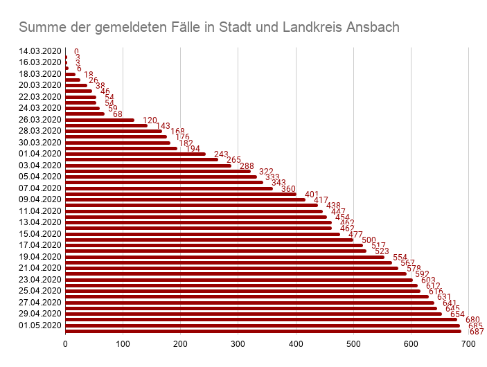 Es gibt 2 weitere Infektionsfälle und damit insgesamt 687 bestätigte Corona-Fälle in Landkreis Ansbach und Stadt Ansbach. 554 der mit dem Coronavirus infizierten Personen stammen aus dem Landkreis Ansbach.