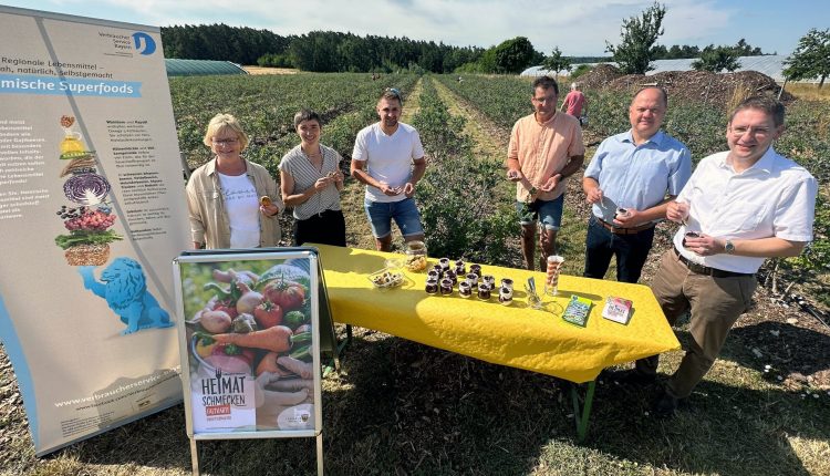 „Mit unserer saisonalen Serie ,Heimat schmecken‘ möchten wir nicht nur auf die vielen Bezugsquellen für regionale Produkte aufmerksam machen, sondern auch Ernährungstipps und Rezeptideen an die Hand geben“, ergänzte Andrea Denzinger, Regionalmanagerin am Landratsamt Ansbach. Die Heidelbeere passt dabei perfekt ins Konzept, denn sie kann feldfrisch gepflückt und entweder direkt als Snack genossen oder zum Beispiel in Joghurts oder Gebäck weiterverarbeitet werden. Wertvolle Inhaltsstoffe sind dabei neben Vitaminen auch die Anthocyane, blauviolette Pflanzenfarbstoffe, die zellschützend wirken. „Reif geerntete Beeren sind dabei besonders reich an Inhaltsstoffen“, erklärte Uta Toellner vom VerbaucherService Bayern im Katholischen Deutschen Frauenbund. Im Gegensatz zu exotischem Superfood wie etwa Gojibeere oder Matcha brauchten regionale Lebensmittel auf dem Weg zum Verbraucher deutlich weniger Verarbeitungsschritte. Dies verringere das Risiko von Schadstoffbelastungen und Verunreinigungen.