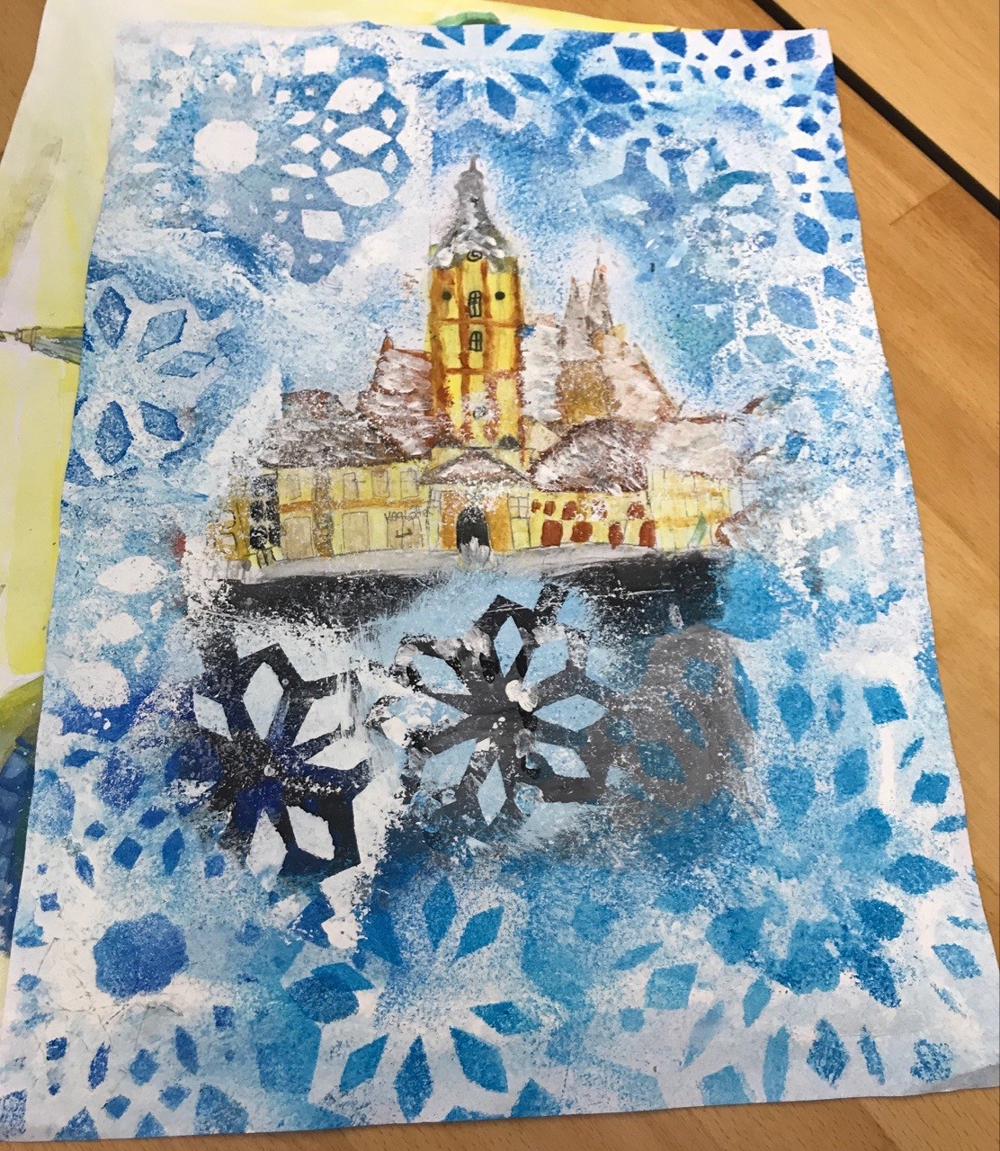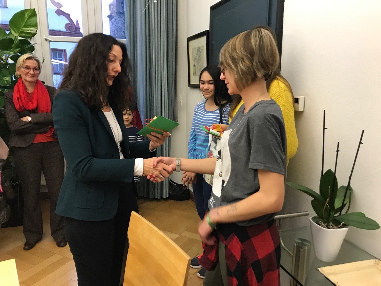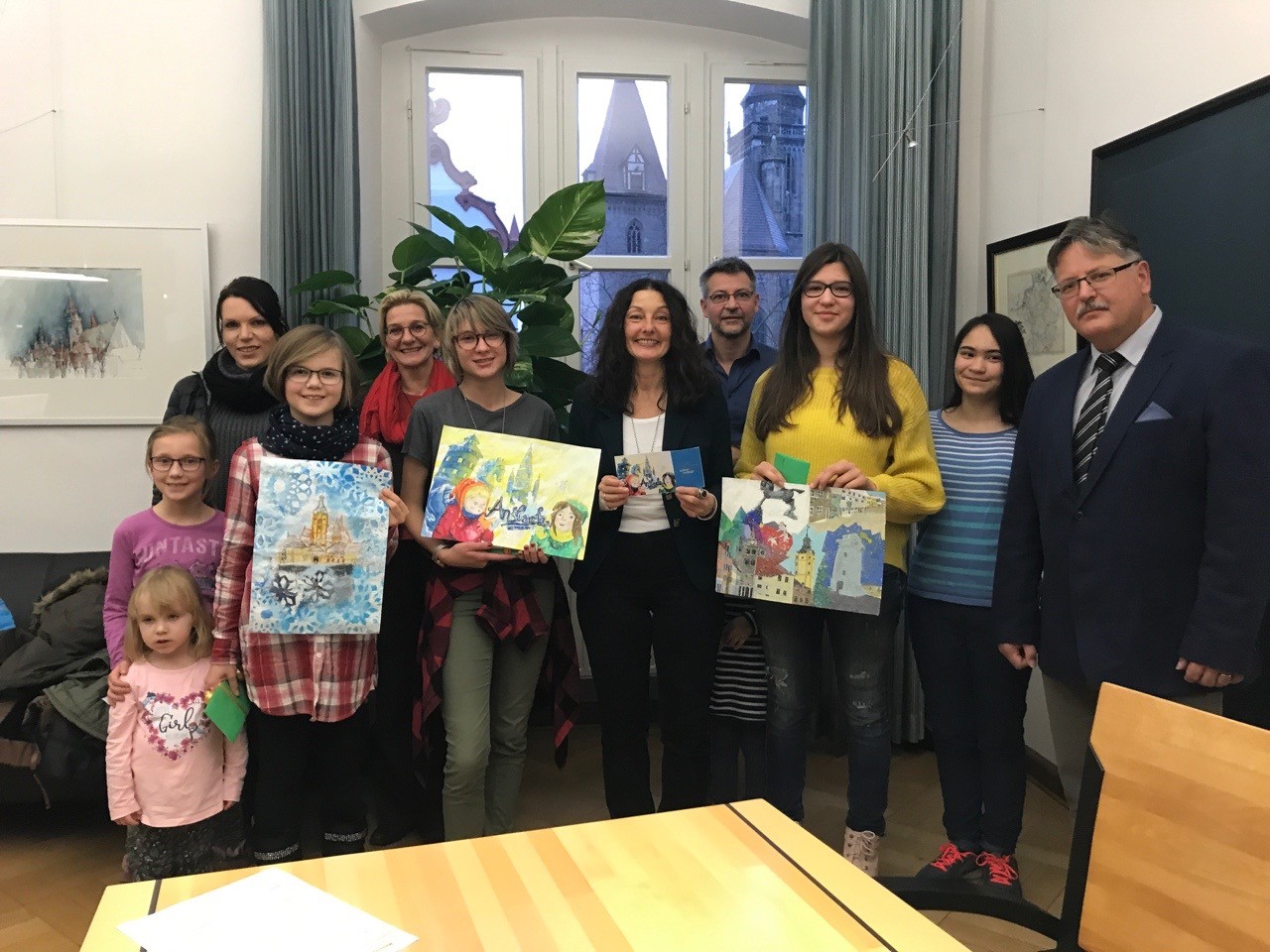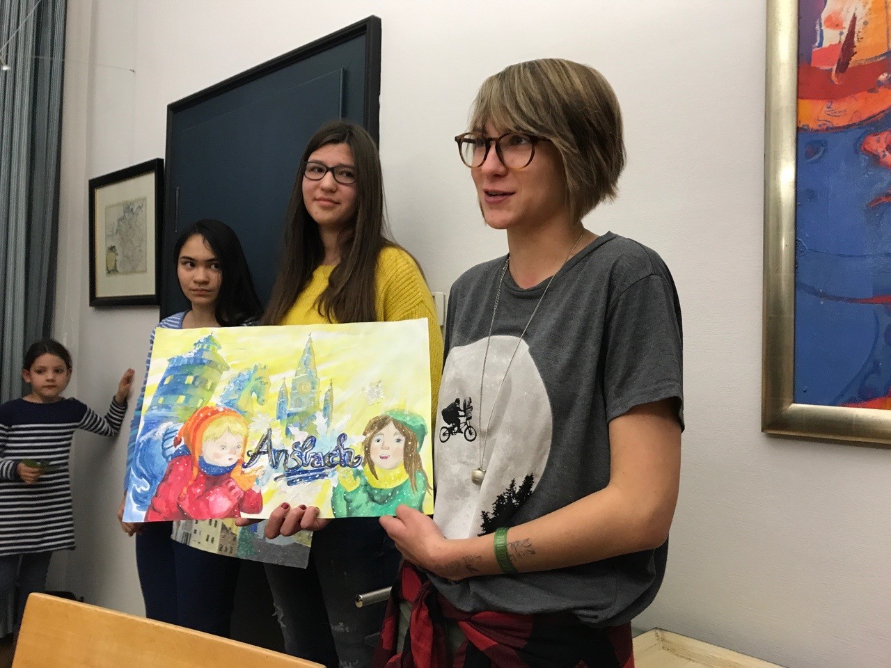 Bereits zum vierten Mal durften sich Ansbacher Schülerinnen und Schüler im Rahmen eines Malwettbewerbs an der Gestaltung der Weihnachts- und Neujahrsgrußkarten der Stadt Ansbach beteiligen. Unter dem Motto „Schneeflocken und Eissterne in Ansbach“ wurde das Bild für die diesjährige Karte gesucht. Teilnahmeberechtigt waren alle Ansbacher Schülerinnen und Schüler von der 5. bis zur 10. Klasse. Eine Jury aus Ansbacher Kunst- und Kulturschaffenden hat drei Gewinner gewählt, die heute (21.11.2017) zur Preisübergabe durch die Oberbürgermeisterin Carda Seidel in deren Amtszimmer im Stadthaus eingeladen wurden. Die Qual der Wahl hatten Dr. Susanne Schulz, Intendantin Theater Ansbach, Helga Heider, Kunstverein Brücke 92 Ansbach, Reiner Grunwald, Maler und Bildhauer, Ute Schlieker, Referentin für Bürgerservice, Kultur, Tourismus, Sport und Bildung, und Renate Weinmann, für die Ausstellung verantwortliche Mitarbeiterin im AKuT.