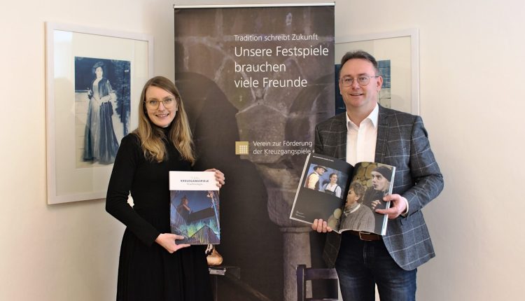 Wie Dr. Wüstenhagen erläuterte, sei bereits zum 70. Geburtstag der Festspiele gezielt ein wiederverwendbares Grundkonzept der Festschrift erstellt worden. „Mit dieser Basis haben wir unser neues Magazin nun mit den jüngsten Ereignissen der letzten fünf Jahre ergänzt und an weiteren Stellen aktualisiert.“ Neu ist unter anderem das Titelbild, welches laut der Kulturbüro-Leiterin in drei Komponenten die Werte der Kreuzgangspiele vereint. Demnach stehe die Stiftskirche für das Historische und Traditionelle, das moderne Geländer für das Zeitgemäße und die satt grün leuchtenden Bäume für die „grüne“ Ausrichtung der Kreuzgangspiele und deren Bestrebungen für mehr Nachhaltigkeit.