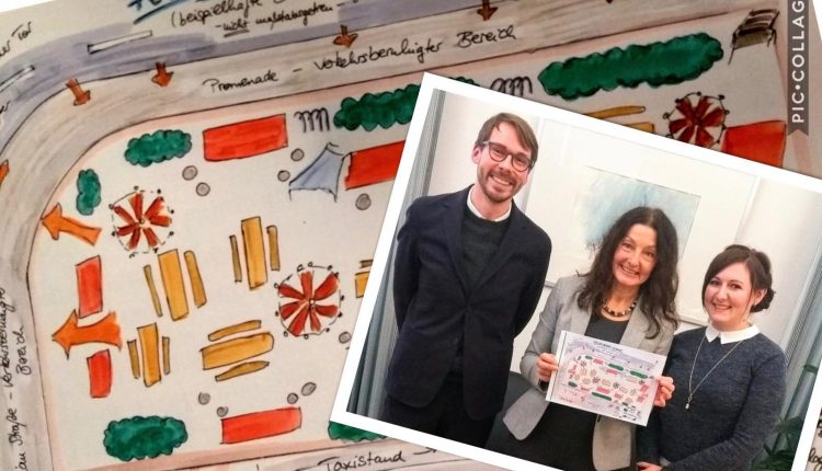 Im Zeitraum von April bis Oktober 2019 wird im zweiwöchigen Rhythmus donnerstags von 16 Uhr bis 20 Uhr die Promenade/Ecke Maximilianstraße bespielt – auch als Gegenspieler zum dazwischen stattfindenden traditionellen Bauernmarkt. Idee war es, ein neues Angebot zu etablieren, das Besucher einlädt, gemeinsam und bei Speisen und Getränken Zeit zu verbringen. In erster Linie soll ein Platz als eine „Versorgungsstation“ entstehen, an dem man, wie an einem traditionellen Markt auch, Produkte des täglichen Bedarfs einkaufen kann. Zwischendurch wird auch für Unterhaltung mit Musik, Straßenkünstler oder Ähnliches gesorgt – „da steht noch nichts Genaueres fest und wir sind offen für Anregungen“, so Jonas Schubert (bis zu dessen Hochzeit Jonas Wolter ;-)), Leiter des Stadtentwicklungsamts. Eine liebevolle Skizze soll uns zeigen, wie sich die Zuständigen des Projektes die Aufteilung und das Bespielen der Promenade vorgestellt haben.