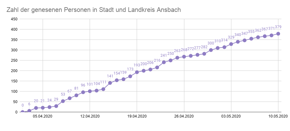582 der mit dem Coronavirus infizierten Personen stammen aus dem Landkreis Ansbach. Davon gelten 379 Personen in Landkreis Ansbach und Stadt Ansbach als genesen.