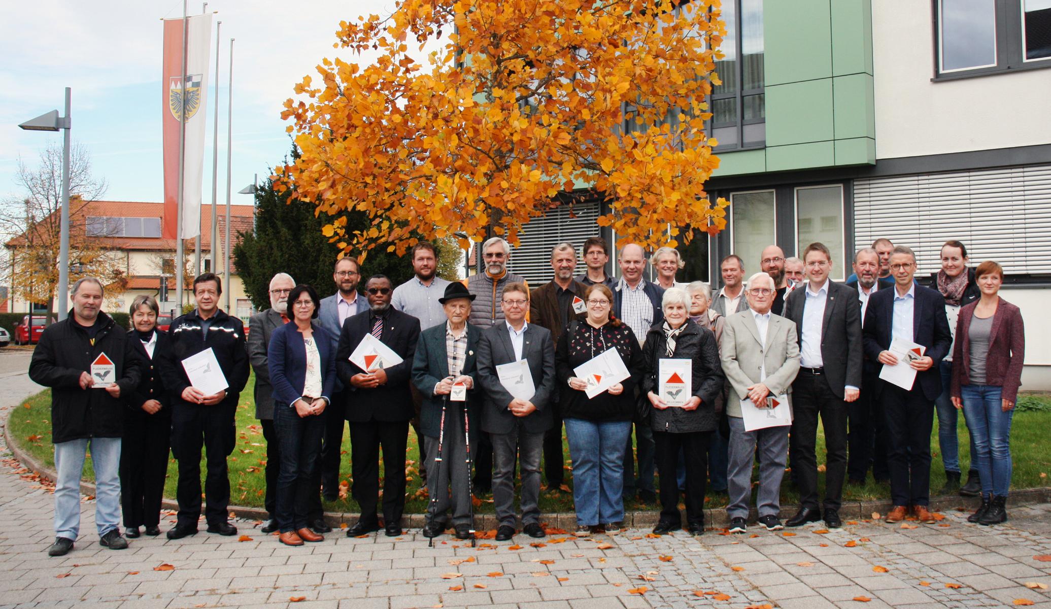 Ansbach, 25.10.2019 – Die Fledermaus ist eine der ältesten Tierarten der Welt und mittlerweile vom Aussterben bedroht. Durch den großen ehrenamtlichen Einsatz zahlreicher Fledermausfreunde sind 17 der insgesamt 25 in Bayern vorkommenden Fledermausarten im Landkreis Ansbach zu finden. Zum Dank für das freiwillige Engagement zum Schutz der Fledermäuse überreichte Landrat Dr. Ludwig rund zwanzig Teilnehmern nun eine Urkunde und die Plakette „Fledermäuse Willkommen“. „Der Schutz unserer Umwelt und damit auch der Artenerhalt ist wichtig, leider jedoch keine Selbstverständlichkeit. Daher danke ich Ihnen für Ihren vorbildlichen Einsatz, der zum Mitmachen und Nachmachen anregen soll.“