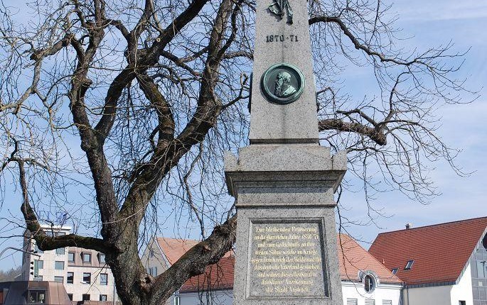 Der Denkmalobelisk vor dem Ansbacher Schloss gegenüber dem Borkholder-Haus (Ecke Promenade/Residenzstraße) dient dem Gedenken an die Verstorbenen des Deutsch-Französischen Krieges von 18070/71. Der aus Syenit gefertigte Obelisk wurde 1898 vom Steinmetzbetrieb Wolfel & Herold aus Bamberg errichtet.
