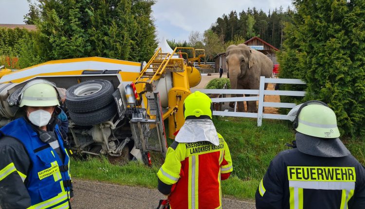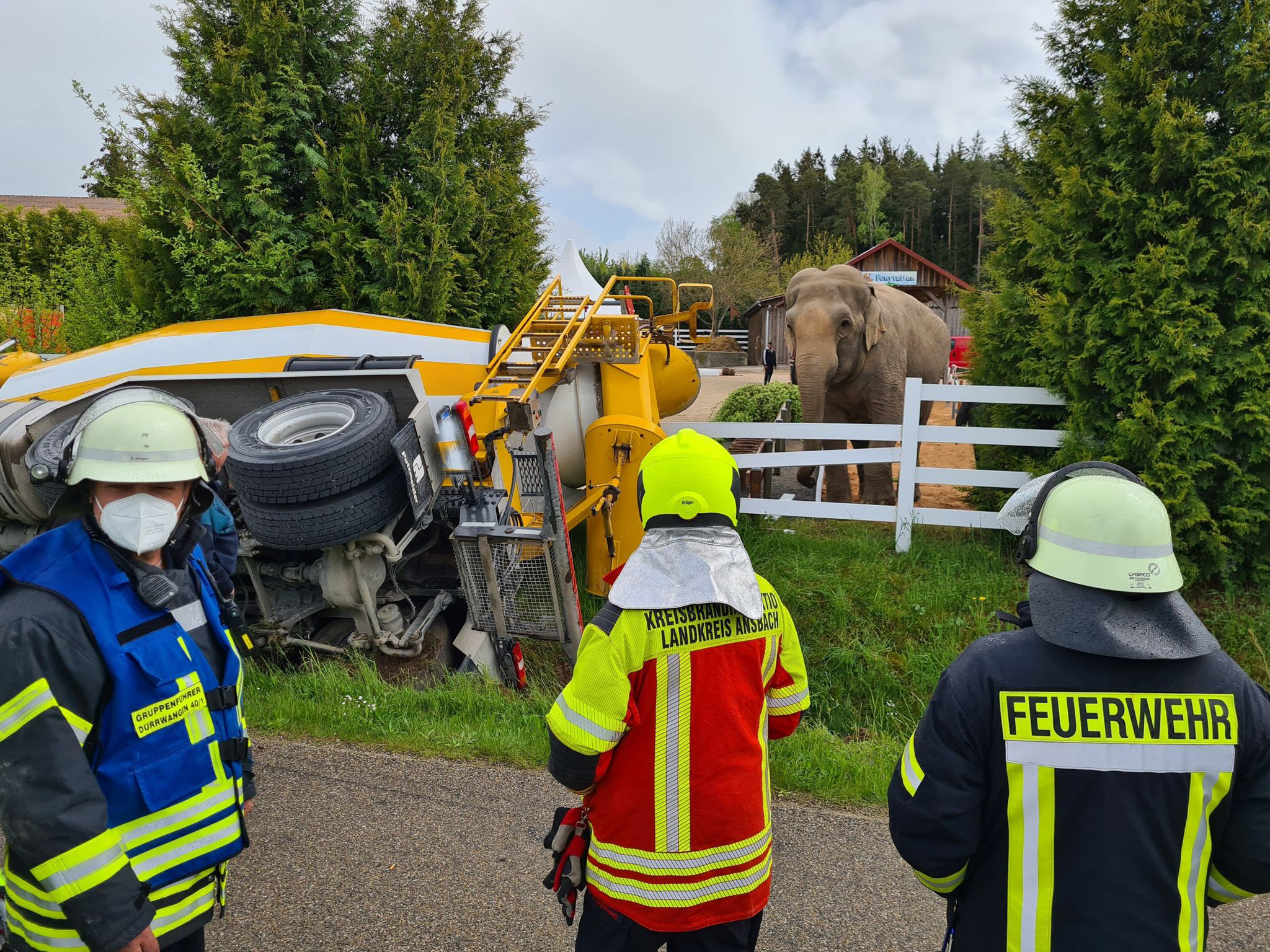 Eine der ersten am Unfallsort war die Elefantin Carla, die das Unfallfahrzeug kurz beschnupperte und sich dann wieder ihrem Mittagessen widmete.