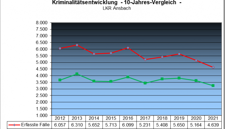 Fazit: Im Landkreis Ansbach kann man sicher leben. Das Risiko, Opfer einer Straftat zu werden ist vergleichsweise gering. Die Aufklärungsquote liegt zwischen dem bayerischen und dem mittelfränkischen Wert. Mehr als zwei Drittel der angezeigten Straftaten konnten aufgeklärt werden.