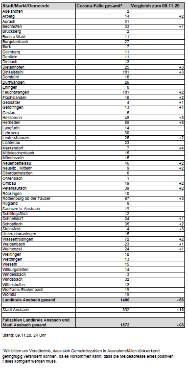 Die 7-Tage-Inzidenz pro 100.000 Einwohner im Ansbacher Landkreis liegt bei 148,44 (Vortag 131,64), bei der Stadt Ansbach bei 165,08 (Vortag 186,61). (Stand: 09.11.2020, 08:00 Uhr)