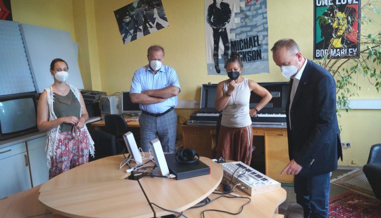 „Wir heißen jede und jeden willkommen, der zu uns kommt. Wer da ist, kann mitgestalten, mitspielen und mit anderen Spaß haben. Aktuell sind das regelmäßig etwa 40 Kinder, die zwischen den ständigen Angeboten zu festen Zeiten wie der Disco oder dem offenen Angebot, bei dem der Kreativität keine Grenzen gesetzt sind, wählen können“, erklärte Andrea Linhardt im Rahmen eines Besuchs von Oberbürgermeister Thomas Deffner, der zusammen mit Sozialreferent Holger Nießlein der Einrichtung einen Besuch abgestattet und sich über aktuelle Entwicklungen informiert hat. Man habe zuletzt den Lockdown genutzt um Räume und Möbelstücke zu renovieren und umzugestalten und auch die Ausstattung zu modernisieren. Ganz neu entstanden ist in Zusammenarbeit mit dem Jugendrat der Stadt Ansbach hierbei ein professionelles Aufnahmestudio mit Synthesizer, DJ-Pult, Aufnahme-Notebook und Absorber. „Wir sind mit dem Jugendrat stets in sehr gutem Austausch und für die Initiative sehr dankbar“, so Linhardt. Knapp 2.000 Euro habe man hierfür investiert, Dank der Sparkassenstiftung werde in naher Zukunft auch eine feste Slackline und mit Unterstützung der Stadtwerke Ansbach ein Trinkwasserspender installiert, ergänzt Anne Strauß weitere nennenswerte Investitionen am Gebäude.