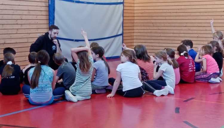 Oberscheckenbach, 1. Februar 2024 – Donnerstag früh, 7:30 Uhr – mit dem Schulgong strömen mehr als 20 Schülerinnen und Schüler der Grundschule Oberscheckenbach in die Turnhalle. Erwartet werden die Drittklässler dort bereits von Christian Jung. Er ist Gewaltpräventionspädagoge und hauptberuflicher Trainer für Selbstverteidigung, Selbstbehauptung und Kick-Boxen.