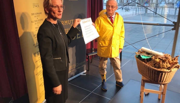 Das Theater Ansbach und seine Akteure sagen ganz herzlichen Dank für die Unterstützung! Als kleine Überraschung hat Antonia Kasecker, 8 Jahre, Hilterhaus und den anderen Anwesenden das Gedicht „Herbsttag“ von Rainer Maria Rilke vorgetragen. Den extra von Jan Hax Halama gebastelten Drachen durfte Hilterhaus zur Erinnerung mit nach Hause nehmen.