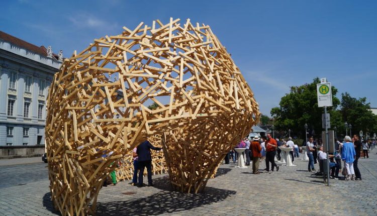 Ansbach, 30. November 2023 – Die Skulptur „Alles im Fluss“ hat durch die kaltnasse Witterung an Stabilität verloren und wird abgebaut. Die Ausstellung „Atelier im öffentlichen Raum“ fand von Ende April bis Anfang Oktober 2023 auf dem Ansbacher Schlossplatz statt.