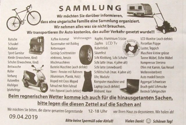 Abgeholt werden sollen, laut diesen Zettel, u.a. Haushaltsschrott, Altkleider, Elektro- und Elektronikgeräte und weitere Gegenstände. Es handelt sich dabei größtenteils um gefährliche Abfälle, die ordnungsgemäß entsorgt werden müssen.
