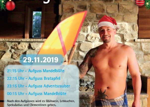 Ab 21.15 Uhr startet das Aufgussprogramm mit der Duftnote Mandelblüte. Im Verlauf des Abends gibt es zudem die Düfte Bratapfel und Adventszauber zum Inhalieren. Nach den Aufgüssen können sich Saunagäste mit Kostproben von Lebkuchen und Spekulatius sowie Clementinen stärken. Dazu wird Glühwein mit und ohne Alkohol gereicht.