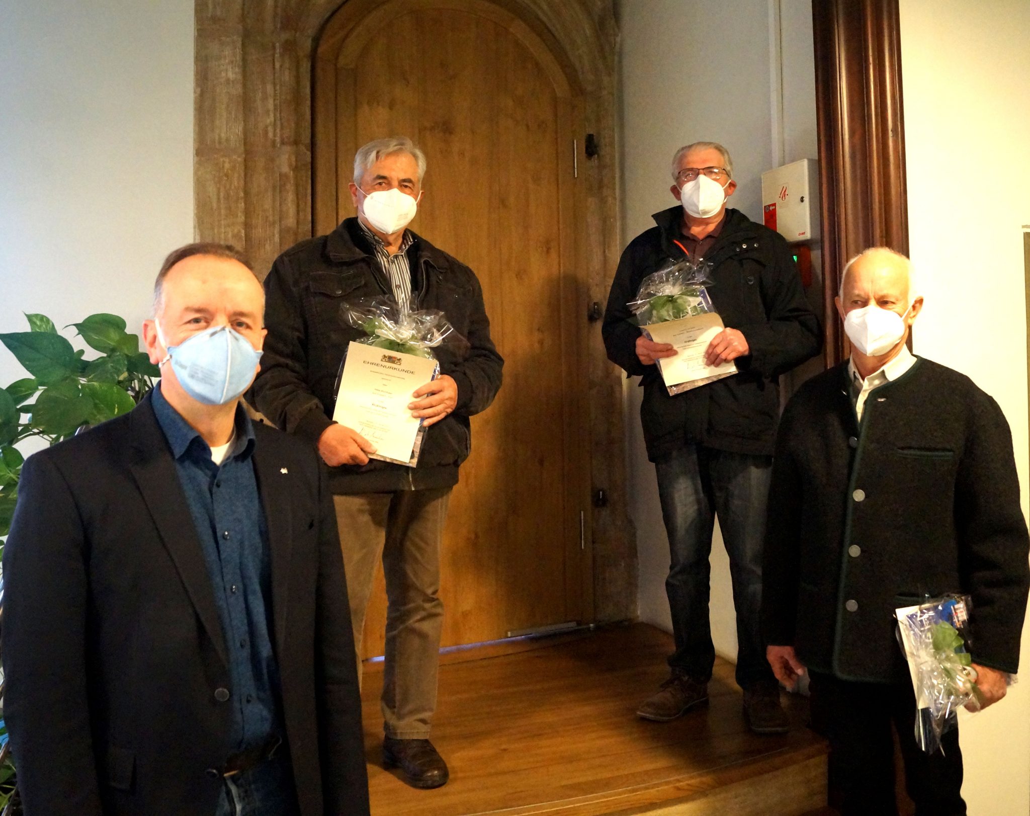 Gerhard Kuhlmann, Gemarkung Neuses und Hans Wurmthaler, Gemarkung Eyb, erhielten die Urkunde unterzeichnet vom Bayerischen Finanz- und Heimatminister Albert Füracker für 40 Jahre Tätigkeit im Siebenerwesen.