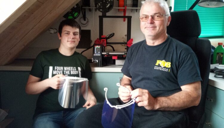 Vater und Sohn traten der MakerVsVirus-Community bei und drucken seitdem mit ihrem 3DDrucker Teile für faceshields, die dann an verschiedene Einrichtungen gehen.