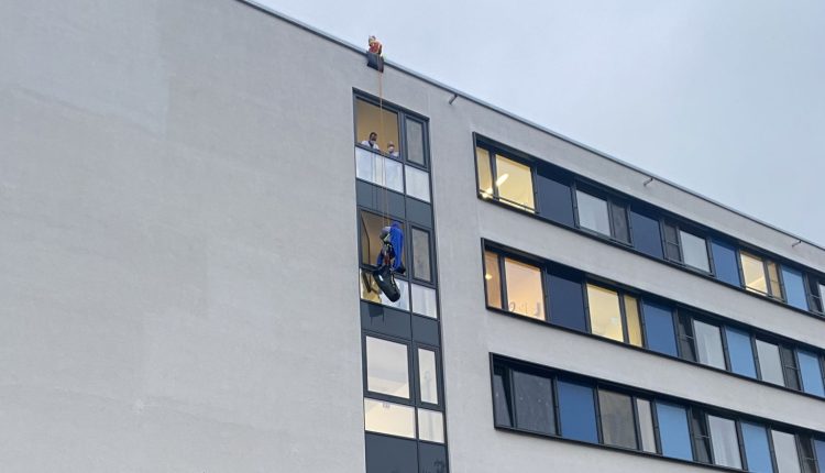 Eine weitere Abseilaktion führte die Höhenrettung zu einigen Mitarbeiterräumen. An die Kinder wurden Schokoladennikoläuse und kleine Geschneke verteilt und auch die Mitarbeitenden wurden mit kleinen Präsenten bedacht.
