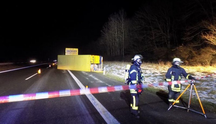 Auf der Autobahn BAB 6 war ein Anhänger eines Lastkraftwagens umgekippt. Das Fahrzeug war mit orangenen Gefahrgutwarntafeln gekennzeichnet.