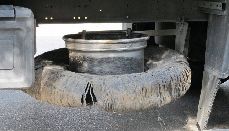 Am Auflieger waren die Bremsbeläge der drei Achsen dermaßen verschlissen, dass bereits Metall auf Metall gerieben hat. Die vordere Stoßstange war abgebrochen und nur notdürftig befestigt und beide Reifen der Vorderachse des Lkw waren rundum ohne Profil.