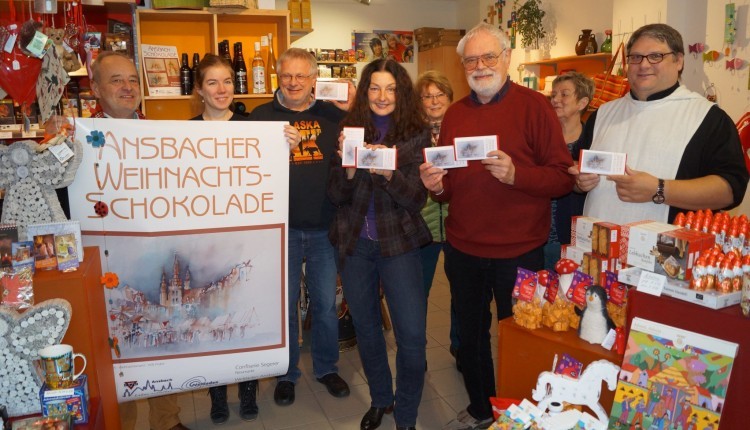 Orangenöl, Zimt und 42 % Kakao – auch in diesem Jahr gibt es wieder eine neue, limitierte Ansbacher Weihnachtsschokolade, selbstverständlich fair gehandelt. Vorgestellt wurde die süße Köstlichkeit von CVJM-Referent Eberhard Schulte, Dekan Hans Stiegler und dem Ansbacher Künstler Willi Probst, von dem auch das Kunstwerk auf der Verpackung stammt. Diesmal: ein Blick über den Martin-Luther-Platz mit Stadthaus und Gumbertuskirche im Hintergrund. Begeistert vom leckeren Geschmack und der schokoladigen Werbung für die Fair-Trade-Stadt Ansbach zeigte sich Oberbürgermeisterin Carda Seidel und bedankte sich für das vielfältige ehrenamtliche Engagement für das Thema Fair-Trade, im CVJM-Weltladen und am Non-profit-Stand auf dem Ansbacher Weihnachtsmarkt.