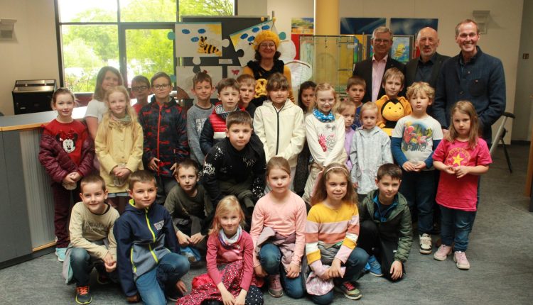Im Anschluss an die Eröffnung vergaben Dramaturg Felix J. Mohr und Disponentin Juliane Abt, die den Malwettbewerb kuratiert hatten, zusammen mit Biene Maja-Darstellerin Maike Frank die Preise an die Kinder und Klassen, welche die schönsten Beiträge eingereicht hatten. Ausgezeichnet wurden die Teilnehmenden in drei Kategorien: „Einzelpreise Kitas“, „Einzelpreise Grundschulen“ und Preise für die gemeinschaftlich angefertigten „Klassenproduktionen“. 14 Preise wurden verliehen, die von Dinkelsbühler Institutionen und Firmen gesponsert wurden. Als Sponsoren beteiligten sich das Projekt „Dinkelsbühler Stadtbiene“ der Stadt Dinkelsbühl, das Leseland Doberstein, der Touristik Service Dinkelsbühl, die Stadtwerke Dinkelsbühl, das Eiscafé Crema Gelato Dinkelsbühl, das Eiscafé Cristallo (Dinkelsbühl) und das funtasia Kinderland. Den ersten Preis in der Kategorie „Einzelpreise Kitas“ erreichte Alina Nick (6 Jahre) aus der Vorschulgruppe „Entdecker“ der Arche unter’m Regenbogen (Mönchsroth) mit einem Bild von der Biene Maja und der Hummel Hubsi. In der Kategorie „Einzelpreise Grundschulen“ konnte Felix Hammele aus der Klasse 2b der Christoph-von-Schmid-Grundschule (Dinkelsbühl) mit einer naturalistisch gemalten Biene den ersten Platz erreichen. In der Kategorie „Klassenproduktionen“ erlangte die evangelische Kindertagesstätte Dietrich Bonhoeffer mit einer kreativen Puzzlecollage, auf der die verschiedenen Bewohner der Blumenwiese zu sehen sind, den ersten Preis. Die Bilder werden noch bis zum 21. Juli 2024 im BeratungsCenter der Sparkasse Ansbach ausgestellt.