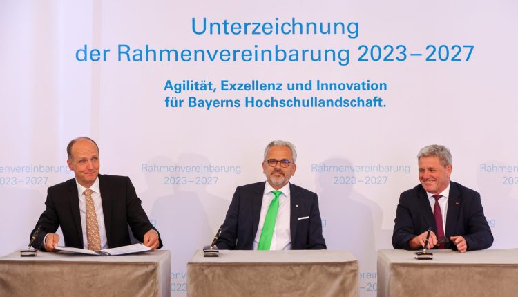 Entscheidender Baustein bei der Umsetzung des neuen Hochschulinnovationsgesetzes und Meilenstein für den Wissenschaftsstandort Bayern: Ministerpräsident Dr. Markus Söder, Wissenschaftsminister Markus Blume und Kultusminister Michael Piazolo haben am 29. Juni 2023 gemeinsam mit den Präsidentinnen und Präsidenten der staatlichen bayerischen Universitäten, Hochschulen für angewandte Wissenschaften und Kunsthochschulen sowie den Ärztlichen Direktoren der Universitätsklinika die Rahmenvereinbarung Hochschulen 2023 bis 2027 – Agilität, Exzellenz und Innovation für Bayerns Hochschullandschaft im Max-Joseph-Saal der Residenz in München unterzeichnet. Dr. Eric Veulliet hat für die Hochschule Weihenstephan-Triesdorf (HSWT) unterschrieben.