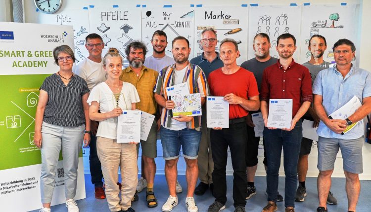 Ansbach, 13. September 2023 – 13 Mitarbeitende aus regionalen KMUs (kleinen und mittleren Unternehmen) haben erfolgreich die Smart & Green Academy der Hochschule Ansbach besucht, um ihre Fähigkeiten im Freihandzeichnen und Skizzieren für bessere Kommunikation und Innovation zu verbessern. Nach 40 Unterrichtseinheiten über sechs Monate haben alle Teilnehmenden die EU-geförderte Weiterbildung „Kommunikation & Innovation durch eigene Skizzen & Grafiken“ der Smart & Green Academy abgeschlossen.