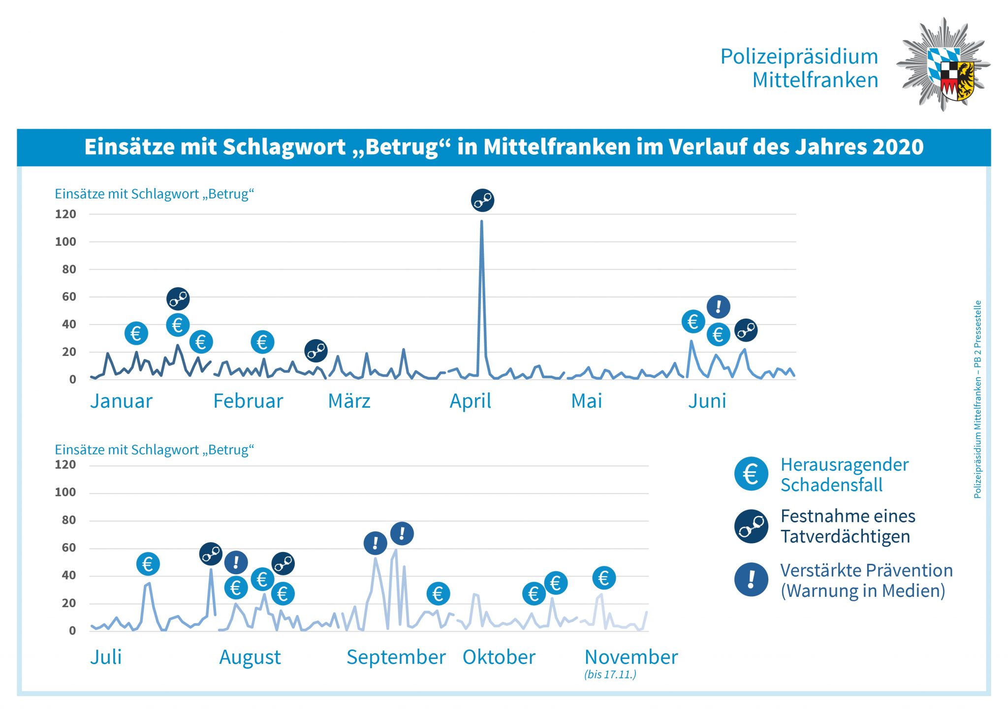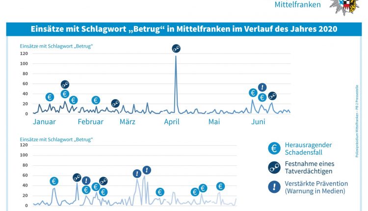 Wie Zacken eines EKG zeichnen sich die Wellen des Telefonbetrugs in den Zahlen der mittelfränkischen Einsatzzentrale wieder (siehe Grafik in der Anlage der Pressemeldung). So waren beispielsweise am Dienstag, 14.07.2020 um 14:00 Uhr und 21:00 Uhr, insgesamt 320 Notrufe zu verzeichnen. Im Vergleich zum Notrufaufkommen an „normalen“ Dienstagen bedeutete dies eine Steigerung um 165 %.