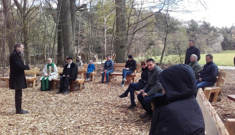 Nach dem Genehmigungsverfahren, den Verkehrssicherungsmaßnahmen, dem Entfernen des Fichtenunterwuchses und der Altfichten, der Wegebaumaßnahmen, dem Bau des Parkplatzes und des Andachtsplatzes sowie dem Beschluss einer Friedhofs- u. Gebührensatzung übergab Dinkelsbühl nun den Naturfriedhof mit einer Segnung seiner Bestimmung.