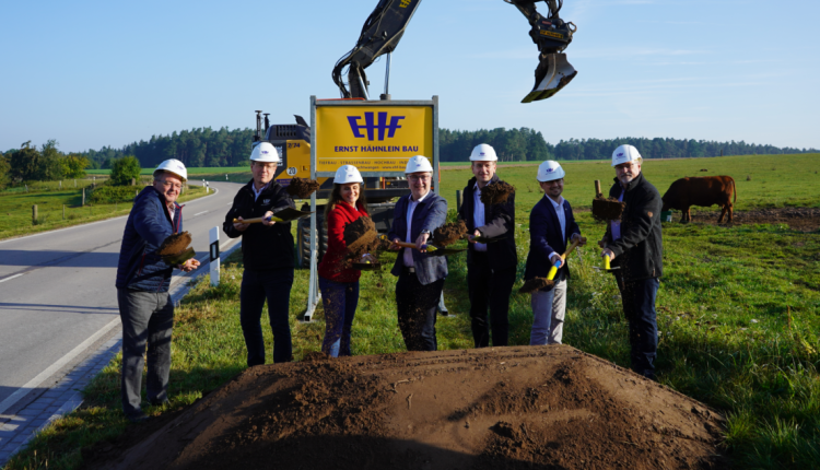 Beim symbolischen Spatenstich waren neben dem Landrat Dr. Jürgen Ludwig, die Vertreter der beiden Kommunen (Dorina Jechnerer, Andreas Baumgärtner, Helmut Schnotz, Bernd Kober) sowie die Fa. Hähnlein und das Ing.-Büro Heller vertreten.