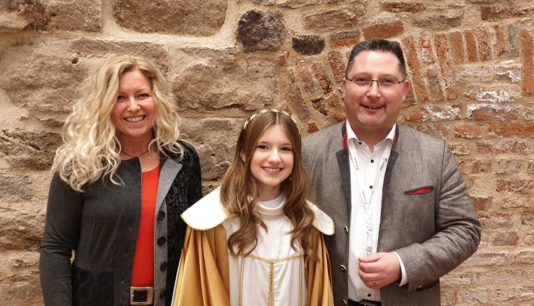 Neues Christkind eröffnet den Weihnachtsmarkt in Herrieden vor dem Stadtschloss