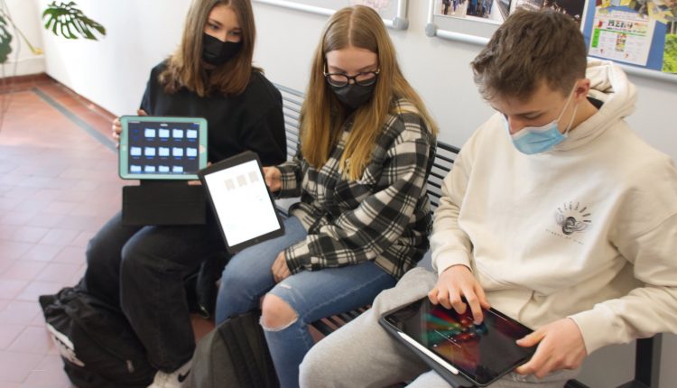 Ein kurzer Griff in die Schultasche und Caroline, Vivien und Franz haben ihr Tablet in der Hand. Und damit alles, was sie für einen Unterrichtstag in der Laurentius-Realschule benötigen.